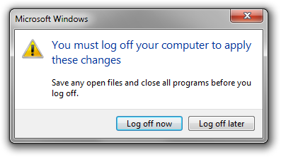 - Windows will present a dialog prompting you to log off in order for the setting to take effect. If you need to save any files or close applications select Log off later, otherwise select Log off now.