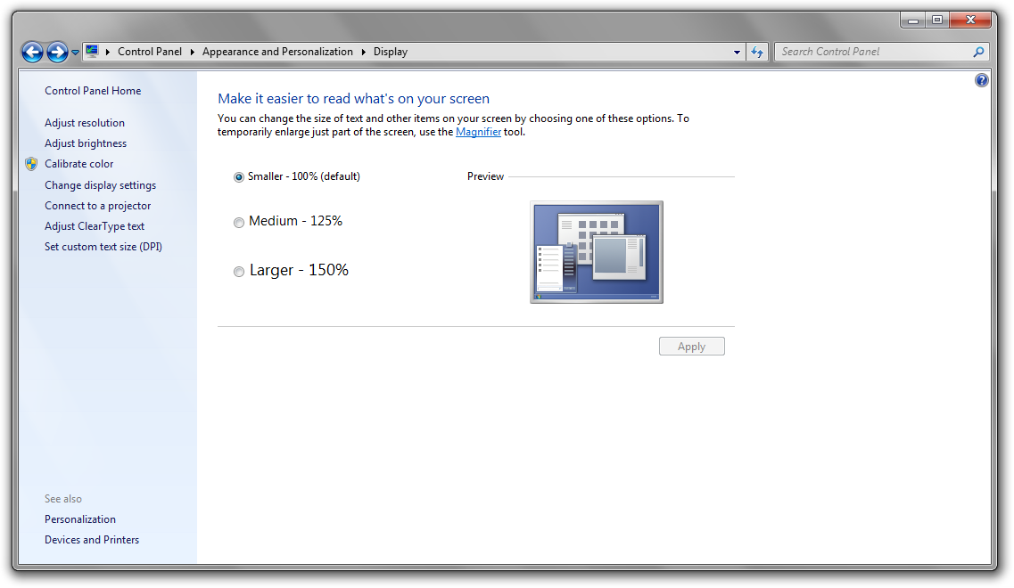 - Open the Control Panel and go to Appearance and Personalization → Display.